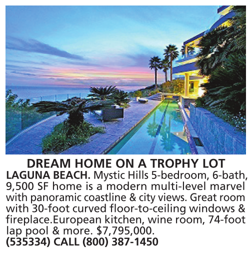 upgrades, DREAM HOME ON A TROPHY LOT LAGUNA BEACH. Mystic Hills 5-bedroom, 6-bath, 9,500 SF home is a modern multi-level marvel with panoramic coastline & city views. Great room with 30-foot curved floor-to-ceiling windows & fireplace.European kitchen, wine room, 74-foot lap pool & more. $7,795,000. (535334) CALL (800) 387-1450