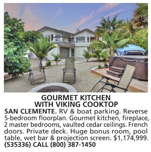 GOURMET KITCHEN WITH VIKING COOKTOP SAN CLEMENTE. RV & boat parking. Reverse 5-bedroom floorplan. Gourmet kitchen, fireplace, 2 master bedrooms, vaulted cedar ceilings. French doors. Private deck. Huge bonus room, pool table, wet bar & projection screen. $1,174,999. (535336) CALL (800) 387-1450