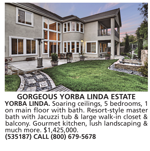 with GORGEOUS YORBA LINDA ESTATE YORBA LINDA. Soaring ceilings, 5 bedrooms, 1 on main floor with bath. Resort-style master bath with Jacuzzi tub & large walk-in closet & balcony. Gourmet kitchen, lush landscaping & much more. $1,425,000. (535187) CALL (800) 679-5678