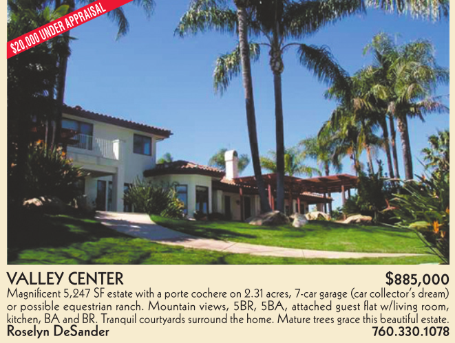 VALLEY CENTER $885,000 Magnificent 5,247 SF estate with a porte cochere on 2.31 acres, 7-car garage (car collector’s dream) or possible equestrian ranch. Mountain views, 5BR, 5BA, attached guest flat w/living room, kitchen, BA and BR. Tranquil courtyards surround the home. Mature trees grace this beautiful estate. Roselyn DeSander 760.330.1078