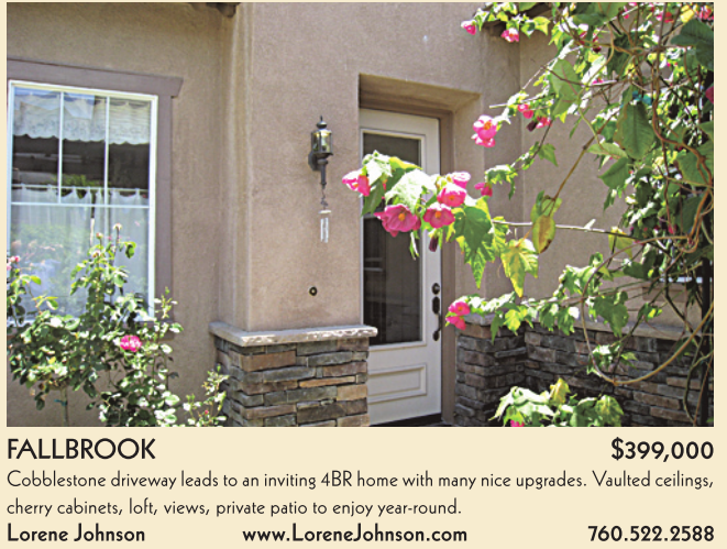 FALLBROOK $399,000 Cobblestone driveway leads to an inviting 4BR home with many nice upgrades. Vaulted ceilings, cherry cabinets, loft, views, private patio to enjoy year-round.
