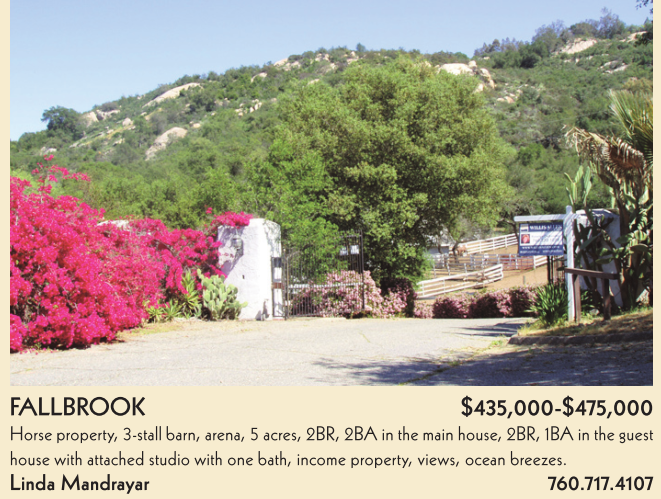 FALLBROOK $435,000-$475,000 Horse property, 3-stall barn, arena, 5 acres, 2BR, 2BA in the main house, 2BR, 1BA in the guest house with attached studio with one bath, income property, views, ocean breezes.