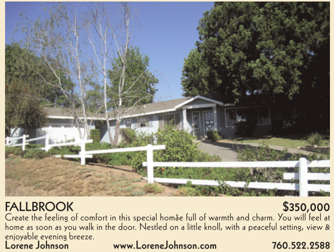 FALLBROOK $350,000 Create the feeling of comfort in this special homåe full of warmth and charm. You will feel at home as soon as you walk in the door. Nestled on a little knoll, with a peaceful setting, view & enjoyable evening breeze. Lorene Johnson www.LoreneJohnson.com 760.522.2588