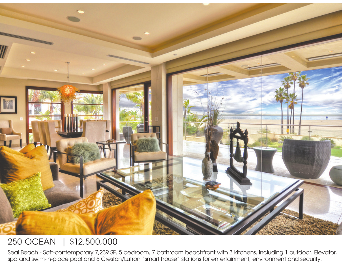 250 OCEAN | $12,500,000 Seal Beach - Soft-contemporary 7,239 SF, 5 bedroom, 7 bathroom beachfront with 3 kitchens, including 1 outdoor. Elevator, spa and swim-in-place pool and 5 Creston/Lutron “smart house” stations for entertainment, environment and security.