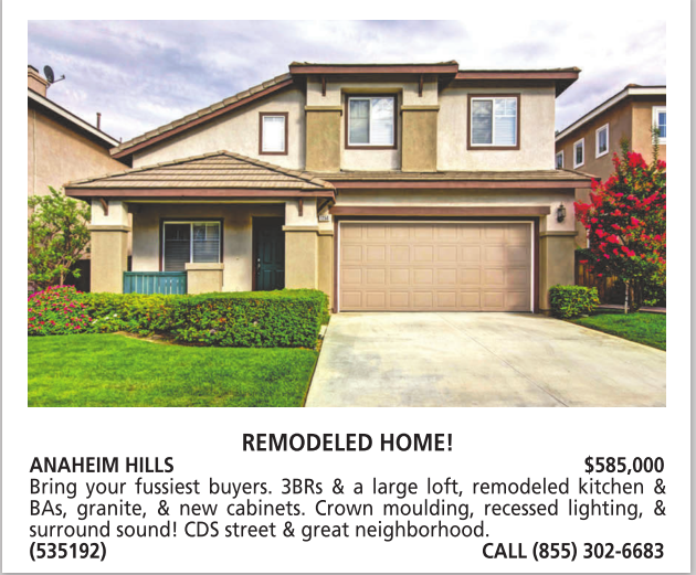 REMODELED HOME! ANAHEIM HILLS $585,000 Bring your fussiest buyers. 3BRs & a large loft, remodeled kitchen & BAs, granite, & new cabinets. Crown moulding, recessed lighting, & surround sound! CDS street & great neighborhood. (535192) CALL (855) 302-6683
