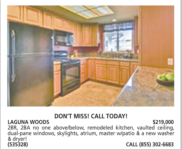 LAGUNA WOODS $219,000 2BR, 2BA no one above/below, remodeled kitchen, vaulted ceiling, dual-pane windows, skylights, atrium, master w/patio & a new washer & dryer! (535328) CALL (855) 302-6683