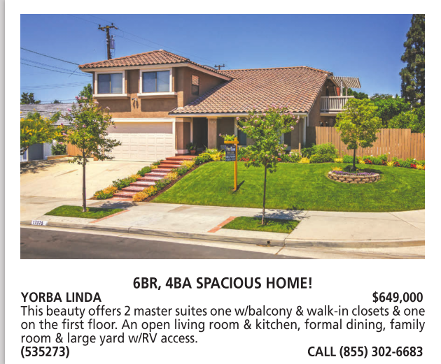 6BR, 4BA SPACIOUS HOME! YORBA LINDA $649,000 This beauty offers 2 master suites one w/balcony & walk-in closets & one on the first floor. An open living room & kitchen, formal dining, family room & large yard w/RV access. (535273) CALL (855) 302-6683