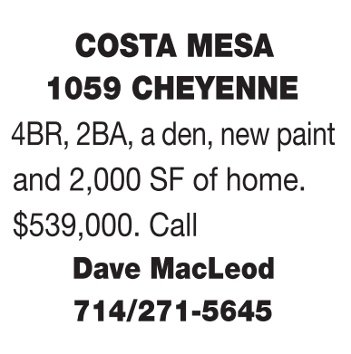 COSTA MESA 1059 CHEYENNE 4BR, 2BA, a den, new paint and 2,000 SF of home. $539,000. Call
