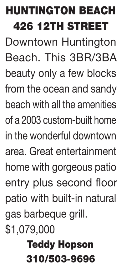 HUNTINGTON BEACH 426 12TH STREET Downtown Huntington Beach. This 3BR/3BA beauty only a few blocks from the ocean and sandy beach with all the amenities of a 2003 custom-built home in the wonderful downtown area. Great entertainment home with gorgeous patio entry plus second fl oor patio with built-in natural gas barbeque grill. $1,079,000 Teddy Hopson 310/503-9696