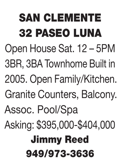 SAN CLEMENTE 32 PASEO LUNA Open House Sat. 12 – 5PM 3BR, 3BA Townhome Built in 2005. Open Family/Kitchen. Granite Counters, Balcony. Assoc. Pool/Spa Asking: $395,000-$404,000