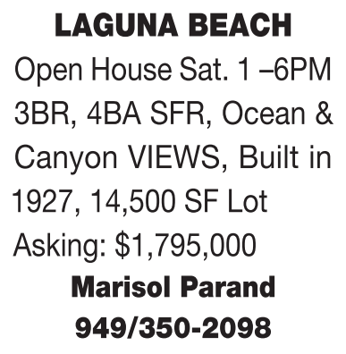 LAGUNA BEACH Open House Sat. 1 –6PM 3BR, 4BA SFR, Ocean & Canyon VIEWS, Built in 1927, 14,500 SF Lot Asking: $1,795,000