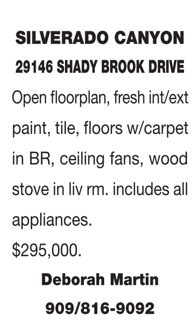 SILVERADO CANYON 29146 SHADY BROOK DRIVE Open floorplan, fresh int/ext paint, tile, floors w/carpet in BR, ceiling fans, wood stove in liv rm. includes all appliances. $295,000.