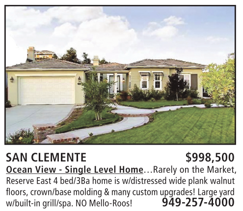 SAN CLEMENTE $998,500 Ocean View - Single Level Home…Rarely on the Market, Reserve East 4 bed/3Ba home is w/distressed wide plank walnut fl oors, crown/base molding & many custom upgrades! Large yard w/built-in grill/spa. NO Mello-Roos! 949-257-4000