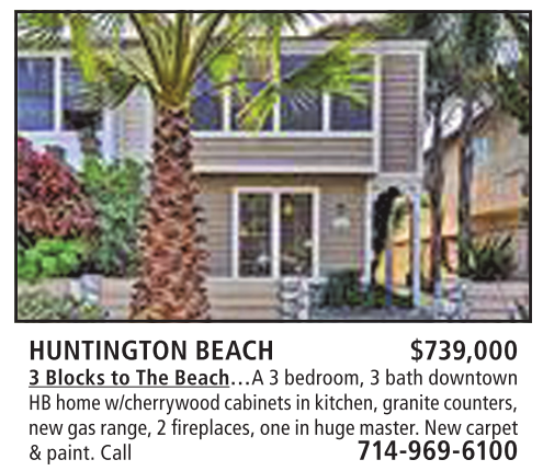 HUNTINGTON BEACH $739,000 3 Blocks to The Beach…A 3 bedroom, 3 bath downtown HB home w/cherrywood cabinets in kitchen, granite counters, new gas range, 2 fireplaces, one in huge master. New carpet & paint. Call 714-969-6100