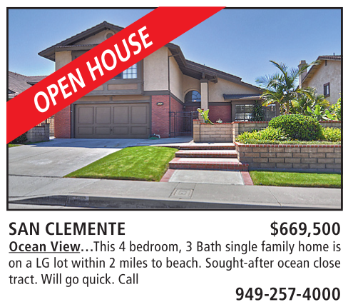 SAN CLEMENTE $669,500 Ocean View…This 4 bedroom, 3 Bath single family home is on a LG lot within 2 miles to beach. Sought-after ocean close tract. Will go quick. Call 949-257-4000