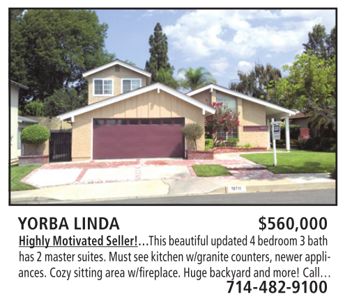 YORBA LINDA $560,000 Highly Motivated Seller!…This beautiful updated 4 bedroom 3 bath has 2 master suites. Must see kitchen w/granite counters, newer appliances. Cozy sitting area w/fireplace. Huge backyard and more! Call… 714-482-9100