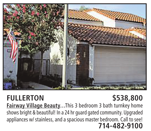 FULLERTON $538,800 Fairway Village Beauty…This 3 bedroom 3 bath turnkey home shows bright & beautiful! In a 24 hr guard gated community. Upgraded appliances w/ stainless, and a spacious master bedroom. Call to see!