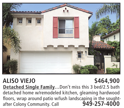 ALISO VIEJO $464,900 Detached Single Family…Don’t miss this 3 bed/2.5 bath detached home w/remodeled kitchen, gleaming hardwood fl oors, wrap around patio w/lush landscaping in the soughtafter Colony Community. Call 949-257-4000