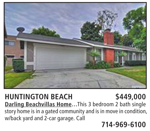 HUNTINGTON BEACH $449,000 Darling Beachvillas Home…This 3 bedroom 2 bath single story home is in a gated community and is in move in condition, w/back yard and 2-car garage. Call 714-969-6100
