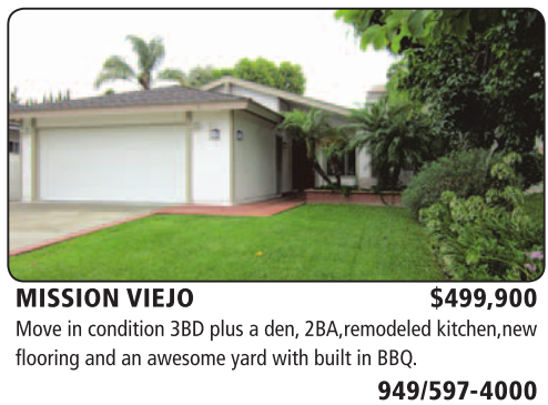 MISSION VIEJO $499,900 Move in condition 3BD plus a den, 2BA,remodeled kitchen,new flooring and an awesome yard with built in BBQ.