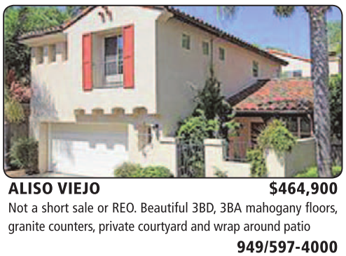 ALISO VIEJO $464,900 Not a short sale or REO. Beautiful 3BD, 3BA mahogany floors, granite counters, private courtyard and wrap around patio 949/597-4000
