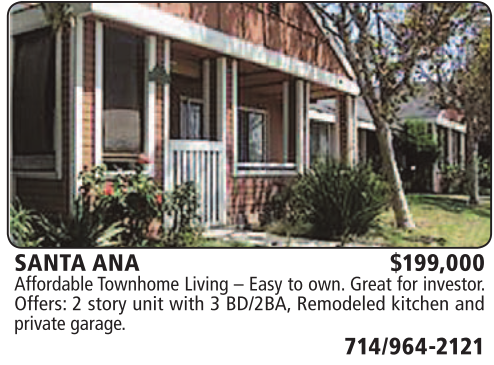SANTA ANA $199,000 Affordable Townhome Living – Easy to own. Great for investor. Offers: 2 story unit with 3 BD/2BA, Remodeled kitchen and private garage.