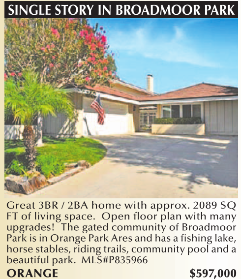 SINGLE STORY IN BROADMOOR PARK Great 3BR / 2BA home with approx. 2089 SQ FT of living space. Open floor plan with many upgrades! The gated community of Broadmoor Park is in Orange Park Ares and has a fishing lake, horse stables, riding trails, community pool and a beautiful park. MLS#P835966 ORANGE $597,000