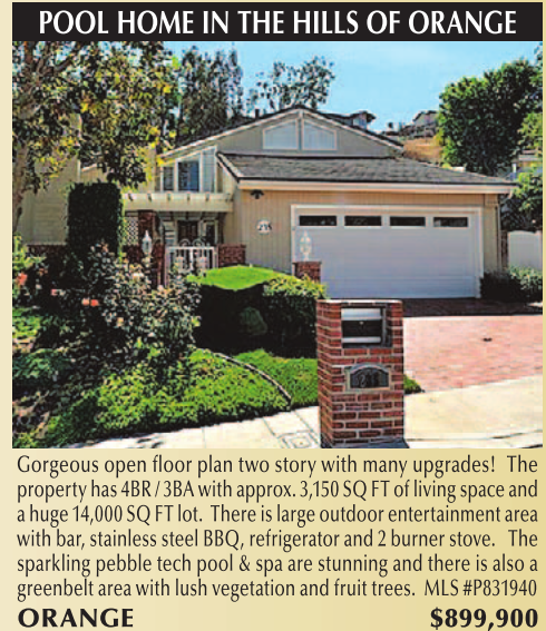 POOL HOME IN THE HILLS OF ORANGE Gorgeous open floor plan two story with many upgrades! The property has 4BR / 3BA with approx. 3,150 SQ FT of living space and a huge 14,000 SQ FT lot. There is large outdoor entertainment area with bar, stainless steel BBQ, refrigerator and 2 burner stove. The sparkling pebble tech pool & spa are stunning and there is also a greenbelt area with lush vegetation and fruit trees. MLS #P831940 ORANGE $899,900