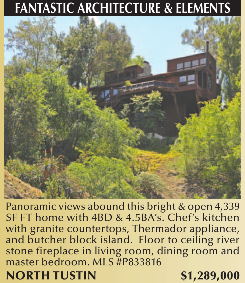 Panoramic views abound this bright & open 4,339 SF FT home with 4BD & 4.5BA’s. Chef’s kitchen with granite countertops, Thermador appliance, and butcher block island. Floor to ceiling river stone fireplace in living room, dining room and master bedroom. MLS #P833816 NORTH TUSTIN $1,289,000