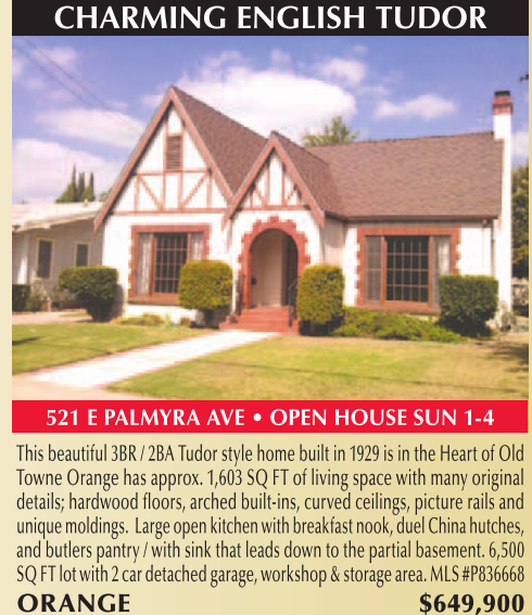 CHARMING ENGLISH TUDOR 521 E PALMYRA AVE • OPEN HOUSE SUN 1-4 This beautiful 3BR / 2BA Tudor style home built in 1929 is in the Heart of Old Towne Orange has approx. 1,603 SQ FT of living space with many original details; hardwood floors, arched built-ins, curved ceilings, picture rails and unique moldings. Large open kitchen with breakfast nook, duel China hutches, and butlers pantry / with sink that leads down to the partial basement. 6,500 SQ FT lot with 2 car detached garage, workshop & storage area. MLS #P836668 ORANGE $649,900