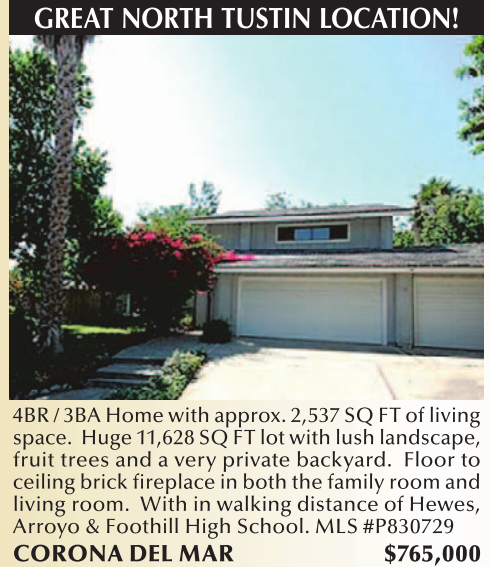 GREAT NORTH TUSTIN LOCATION! 4BR / 3BA Home with approx. 2,537 SQ FT of living space. Huge 11,628 SQ FT lot with lush landscape, fruit trees and a very private backyard. Floor to ceiling brick fireplace in both the family room and living room. With in walking distance of Hewes, Arroyo & Foothill High School. MLS #P830729 CORONA DEL MAR $765,000