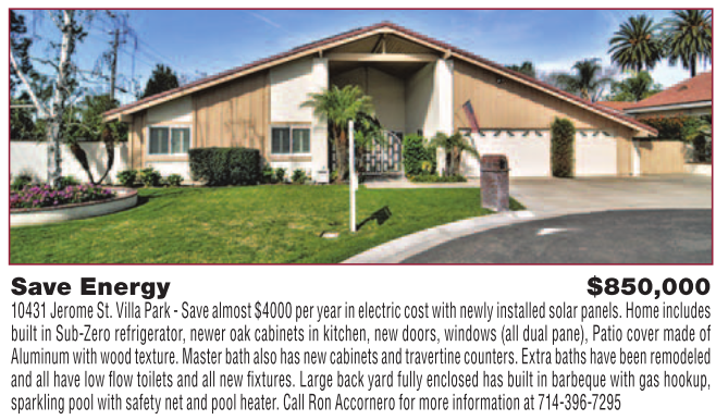Save Energy $850,000 10431 Jerome St. Villa Park - Save almost $4000 per year in electric cost with newly installed solar panels. Home includes built in Sub-Zero refrigerator, newer oak cabinets in kitchen, new doors, windows (all dual pane), Patio cover made of Aluminum with wood texture. Master bath also has new cabinets and travertine counters. Extra baths have been remodeled and all have low fl ow toilets and all new fi xtures. Large back yard fully enclosed has built in barbeque with gas hookup, sparkling pool with safety net and pool heater. Call Ron Accornero for more information at 714-396-7295