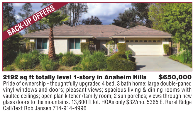 2192 sq ft totally level 1-story in Anaheim Hills $650,000 Pride of ownership - thoughtfully upgraded 4 bed, 3 bath home: large double-paned vinyl windows and doors; pleasant views; spacious living & dining rooms with vaulted ceilings; open plan kitchen/family room; 2 sun porches; views through new glass doors to the mountains. 13,600 ft lot. HOAs only $32/mo. 5365 E. Rural Ridge Call/text Rob Jansen 714-914-4996