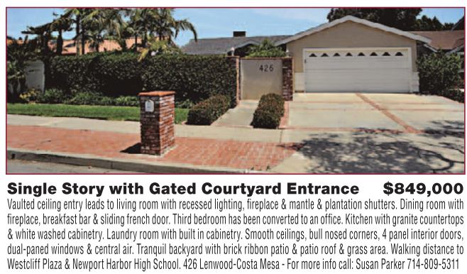 Single Story with Gated Courtyard Entrance $849,000 Vaulted ceiling entry leads to living room with recessed lighting, fi replace & mantle & plantation shutters. Dining room with fi replace, breakfast bar & sliding french door. Third bedroom has been converted to an offi ce. Kitchen with granite countertops & white washed cabinetry. Laundry room with built in cabinetry. Smooth ceilings, bull nosed corners, 4 panel interior doors, dual-paned windows & central air. Tranquil backyard with brick ribbon patio & patio roof & grass area. Walking distance to Westcliff Plaza & Newport Harbor High School. 426 Lenwood-Costa Mesa - For more info call: Susan Parker 714-809-5311