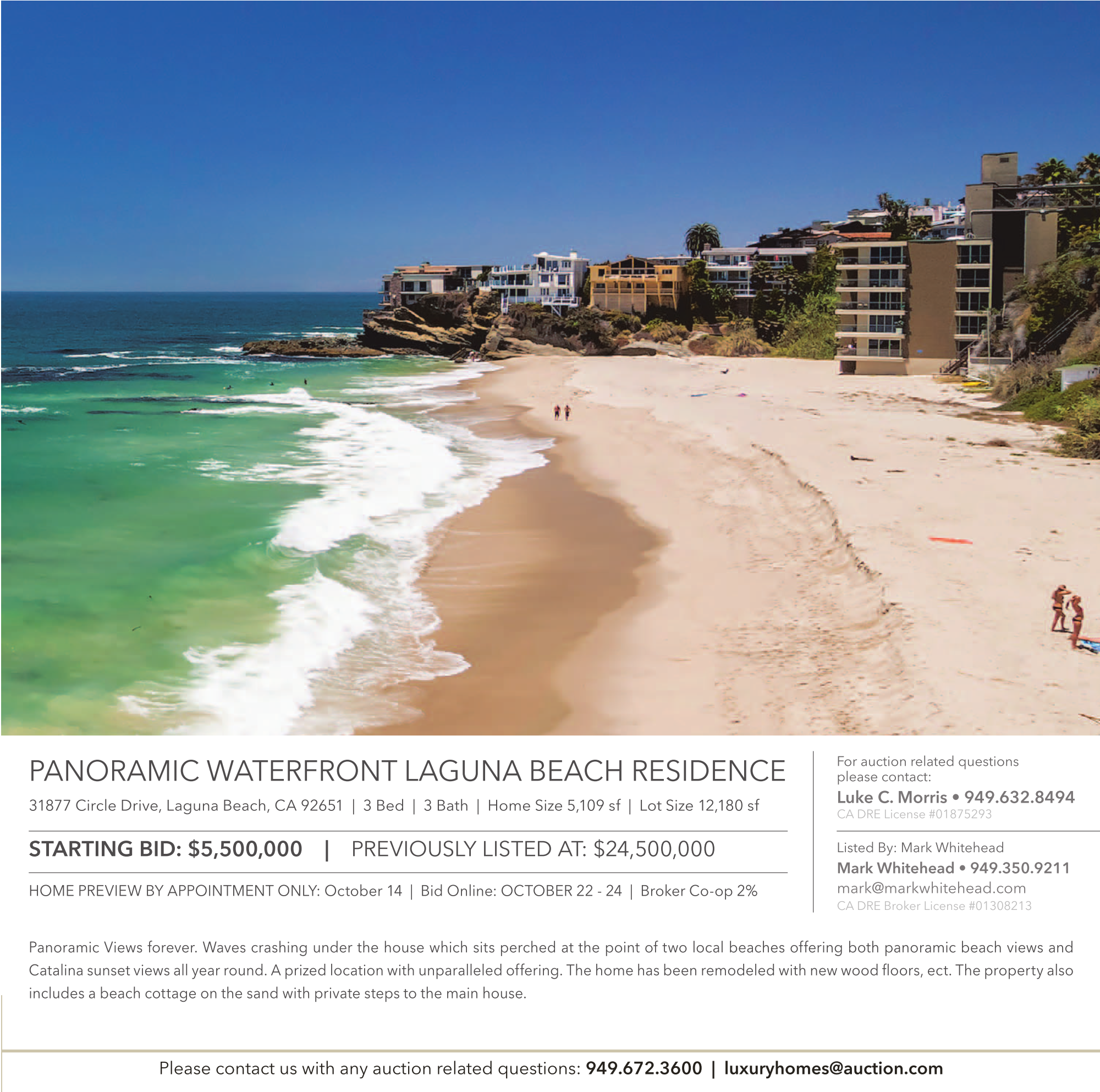 PANORAMIC WATERFRONT LAGUNA BEACH RESIDENCE 31877 Circle Drive, Laguna Beach, CA 92651 | 3 Bed | 3 Bath | Home Size 5,109 sf | Lot Size 12,180 sf For auction related questions please contact: Luke C. Morris • 949.632.8494 CA DRE License #01875293 STARTING BID: $5,500,000 | PREVIOUSLY LISTED AT: $24,500,000 HOME PREVIEW BY APPOINTMENT ONLY: October 14 | Bid Online: OCTOBER 22 - 24 | Broker Co-op 2% Listed By: Mark Whitehead Mark Whitehead • 949.350.9211 mark@markwhitehead.com CA DRE Broker License #01308213 Panoramic Views forever. Waves crashing under the house which sits perched at the point of two local beaches offering both panoramic beach views and Catalina sunset views all year round. A prized location with unparalleled offering. The home has been remodeled with new wood floors, ect. The property also includes a beach cottage on the sand with private steps to the main house. Please contact us with any auction related questions: 949.672.3600 | luxuryhomes@auction.com