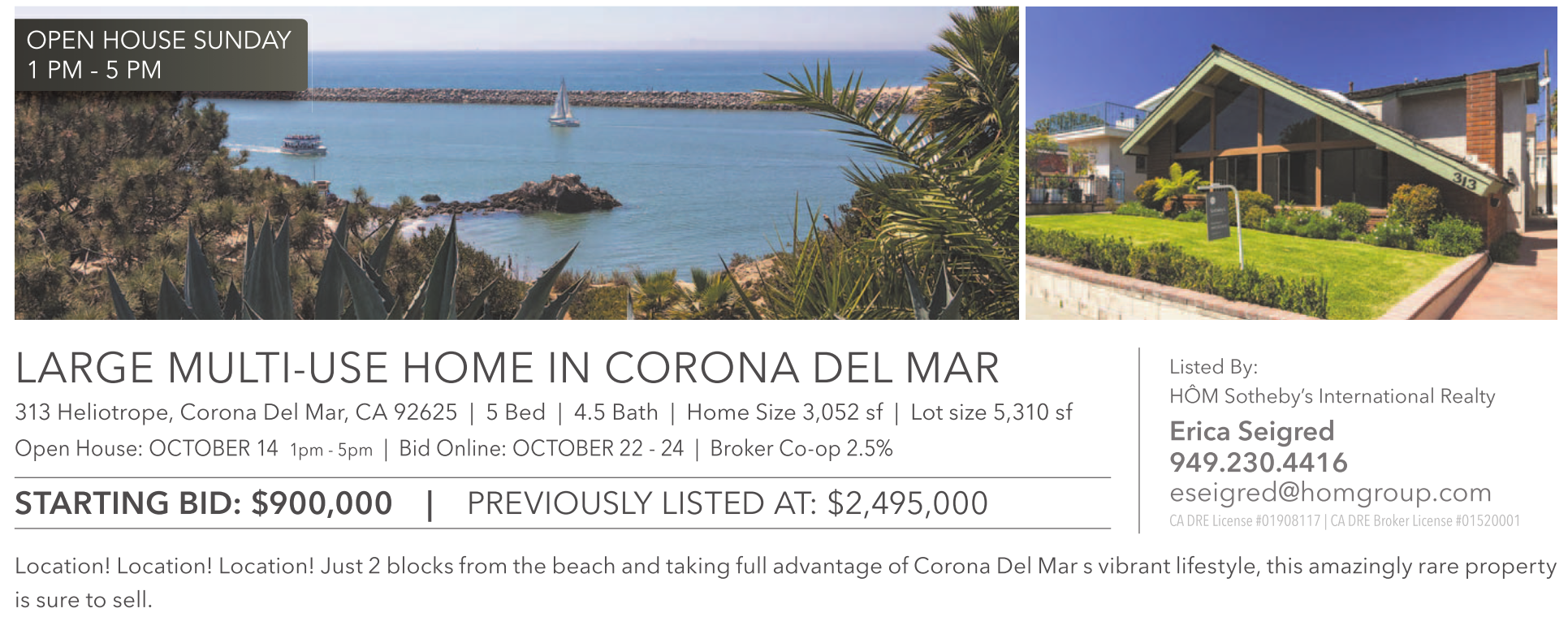 313 Heliotrope, Corona Del Mar, CA 92625 | 5 Bed | 4.5 Bath | Home Size 3,052 sf | Lot size 5,310 sf Open House: OCTOBER 14 1pm - 5pm | Bid Online: OCTOBER 22 - 24 | Broker Co-op 2.5%