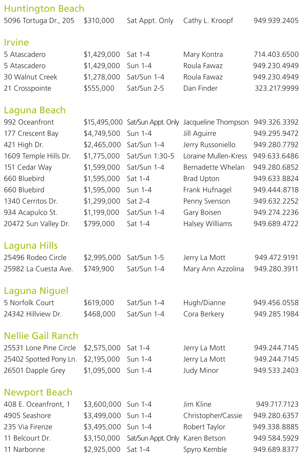 992 Oceanfront $15,495,000 Sat/Sun Appt. Only Jacqueline Thompson 949.326.3392 177 Crescent Bay $4,749,500 Sun 1-4 Jill Aguirre 949.295.9472 421 High Dr. $2,465,000 Sat/Sun 1-4 Jerry Russoniello 949.280.7792 1609 Temple Hills Dr. $1,775,000 Sat/Sun 1:30-5 Loraine Mullen-Kress 949.633.6486 151 Cedar Way $1,599,000 Sat/Sun 1-4 Bernadette Whelan 949.280.6852 660 Bluebird $1,595,000 Sat 1-4 Brad Upton 949.633.8824 660 Bluebird $1,595,000 Sun 1-4 Frank Hufnagel 949.444.8718 1340 Cerritos Dr. $1,299,000 Sat 2-4 Penny Svenson 949.632.2252 934 Acapulco St. $1,199,000 Sat/Sun 1-4 Gary Boisen 949.274.2236 20472 Sun Valley Dr. $799,000 Sat 1-4 Halsey Williams 949.689.4722