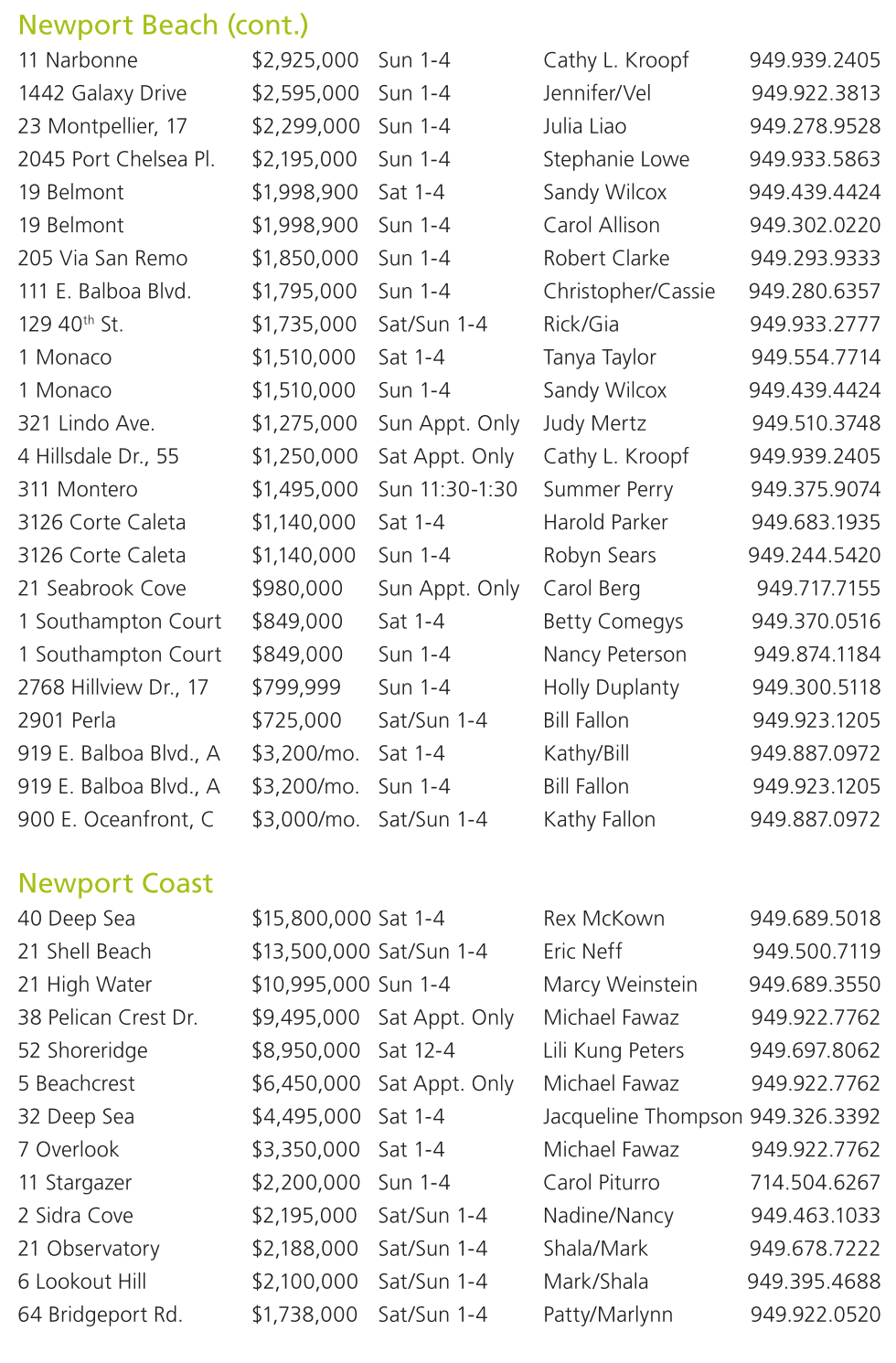 11 Narbonne $2,925,000 Sun 1-4 Cathy L. Kroopf 949.939.2405 1442 Galaxy Drive $2,595,000 Sun 1-4 Jennifer/Vel 949.922.3813 23 Montpellier, 17 $2,299,000 Sun 1-4 Julia Liao 949.278.9528 2045 Port Chelsea Pl. $2,195,000 Sun 1-4 Stephanie Lowe 949.933.5863 19 Belmont $1,998,900 Sat 1-4 Sandy Wilcox 949.439.4424 19 Belmont $1,998,900 Sun 1-4 Carol Allison 949.302.0220 205 Via San Remo $1,850,000 Sun 1-4 Robert Clarke 949.293.9333 111 E. Balboa Blvd. $1,795,000 Sun 1-4 Christopher/Cassie 949.280.6357 129 40 th St. $1,735,000 Sat/Sun 1-4 Rick/Gia 949.933.2777 1 Monaco $1,510,000 Sat 1-4 Tanya Taylor 949.554.7714 1 Monaco $1,510,000 Sun 1-4 Sandy Wilcox 949.439.4424 321 Lindo Ave. $1,275,000 Sun Appt. Only Judy Mertz 949.510.3748 4 Hillsdale Dr., 55 $1,250,000 Sat Appt. Only Cathy L. Kroopf 949.939.2405 311 Montero $1,495,000 Sun 11:30-1:30 Summer Perry 949.375.9074 3126 Corte Caleta $1,140,000 Sat 1-4 Harold Parker 949.683.1935 3126 Corte Caleta $1,140,000 Sun 1-4 Robyn Sears 949.244.5420 21 Seabrook Cove $980,000 Sun Appt. Only Carol Berg 949.717.7155 1 Southampton Court $849,000 Sat 1-4 Betty Comegys 949.370.0516 1 Southampton Court $849,000 Sun 1-4 Nancy Peterson 949.874.1184 2768 Hillview Dr., 17 $799,999 Sun 1-4 Holly Duplanty 949.300.5118 2901 Perla $725,000 Sat/Sun 1-4 Bill Fallon 949.923.1205 919 E. Balboa Blvd., A $3,200/mo. Sat 1-4 Kathy/Bill 949.887.0972 919 E. Balboa Blvd., A $3,200/mo. Sun 1-4 Bill Fallon 949.923.1205 900 E. Oceanfront, C $3,000/mo. Sat/Sun 1-4 Kathy Fallon 949.887.0972