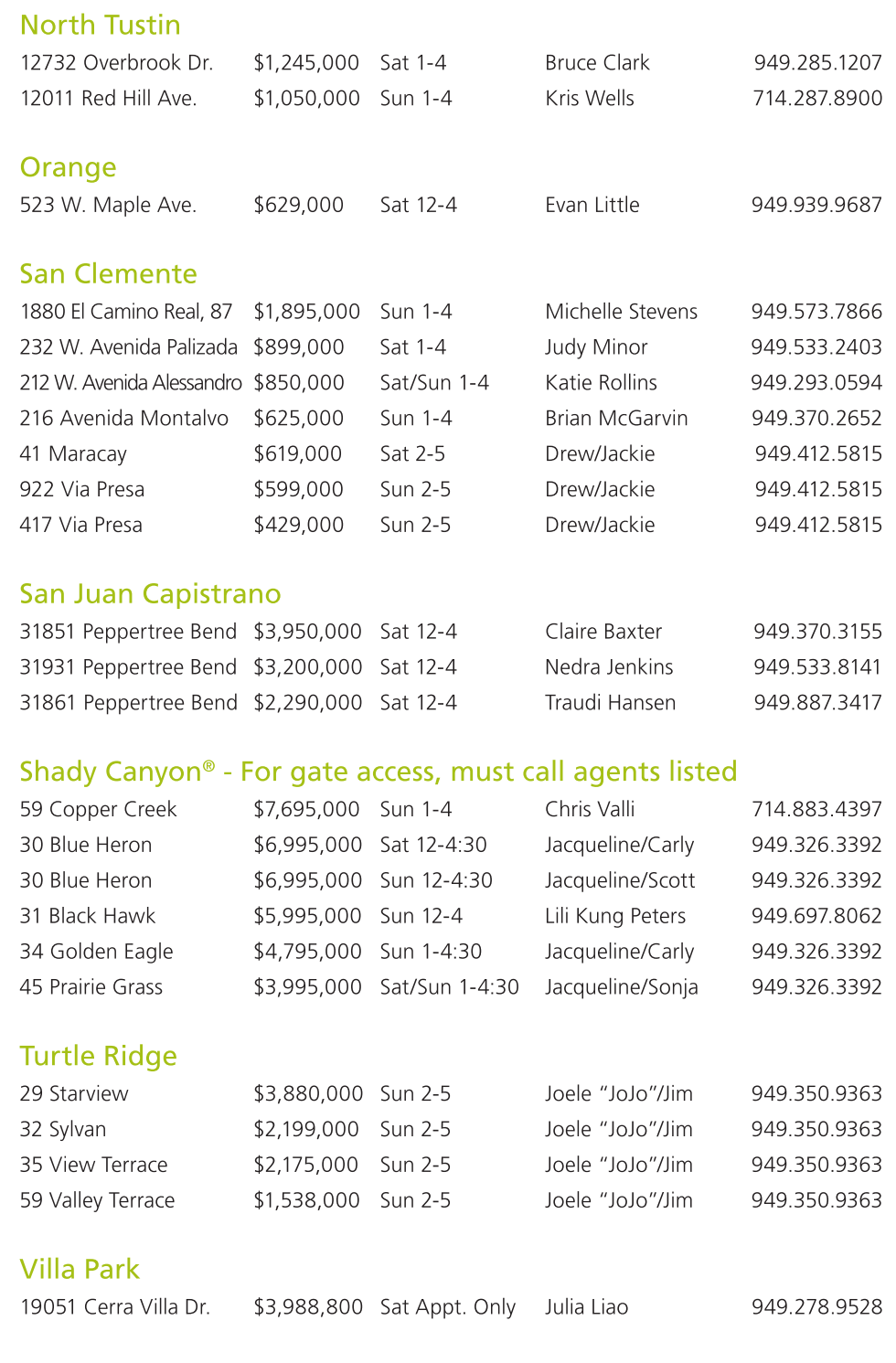 31851 Peppertree Bend $3,950,000 Sat 12-4 Claire Baxter 949.370.3155 31931 Peppertree Bend $3,200,000 Sat 12-4 Nedra Jenkins 949.533.8141 31861 Peppertree Bend $2,290,000 Sat 12-4 Traudi Hansen 949.887.3417