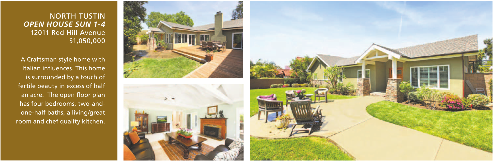 NORTH TUSTIN OPEN HOUSE SUN 1-4 12011 Red Hill Avenue $1,050,000 A Craftsman style home with Italian influences. This home is surrounded by a touch of fertile beauty in excess of half an acre. The open floor plan has four bedrooms, two-andone-half baths, a living/great room and chef quality kitchen.