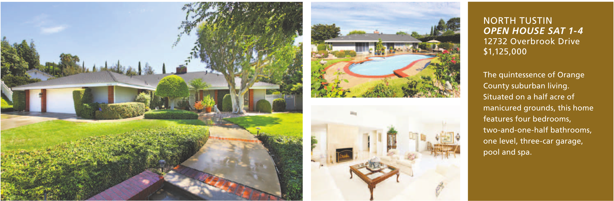 NORTH TUSTIN OPEN HOUSE SAT 1-4 12732 Overbrook Drive $1,125,000 The quintessence of Orange County suburban living. Situated on a half acre of manicured grounds, this home features four bedrooms, two-and-one-half bathrooms, one level, three-car garage, pool and spa.