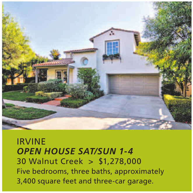 IRVINE OPEN HOUSE SAT/SUN 1-4 30 Walnut Creek > $1,278,000 Five bedrooms, three baths, approximately 3,400 square feet and three-car garage.