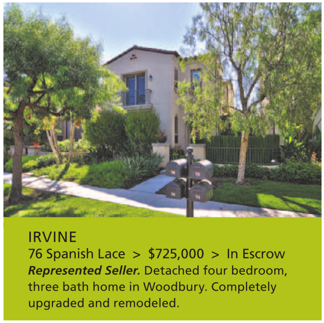 IRVINE 76 Spanish Lace > $725,000 > In Escrow Represented Seller. Detached four bedroom, three bath home in Woodbury. Completely upgraded and remodeled.