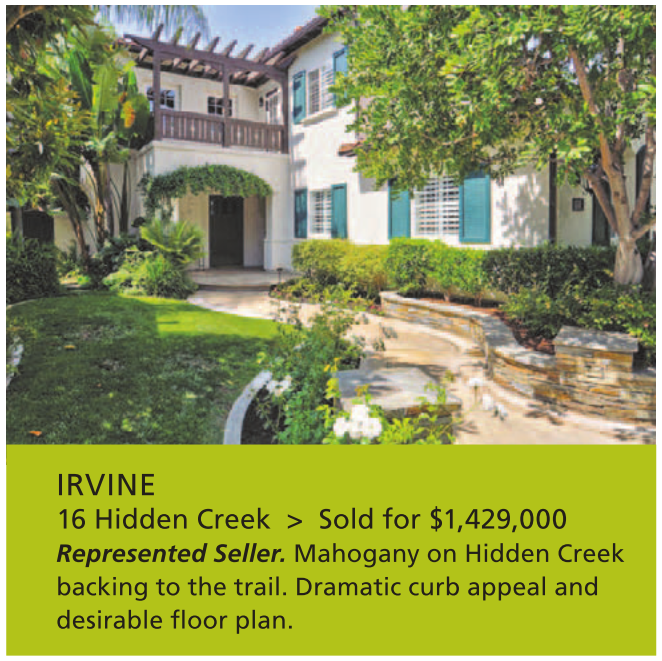 IRVINE 16 Hidden Creek > Sold for $1,429,000 Represented Seller. Mahogany on Hidden Creek backing to the trail. Dramatic curb appeal and desirable floor plan.