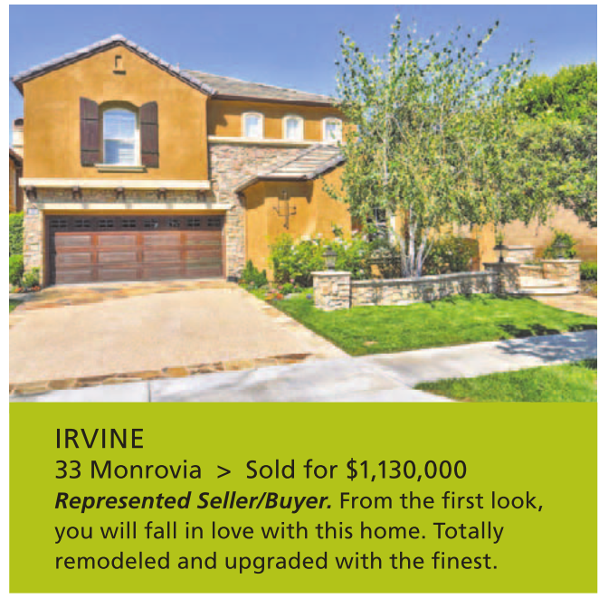 IRVINE 33 Monrovia > Sold for $1,130,000 Represented Seller/Buyer. From the first look, you will fall in love with this home. Totally remodeled and upgraded with the finest.