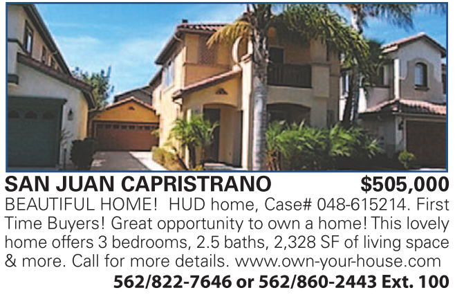 SAN JUAN CAPRISTRANO $505,000 BEAUTIFUL HOME! HUD home, Case# 048-615214. First Time Buyers! Great opportunity to own a home! This lovely home offers 3 bedrooms, 2.5 baths, 2,328 SF of living space & more. Call for more details. www.own-your-house.com 562/822-7646 or 562/860-2443 Ext. 100