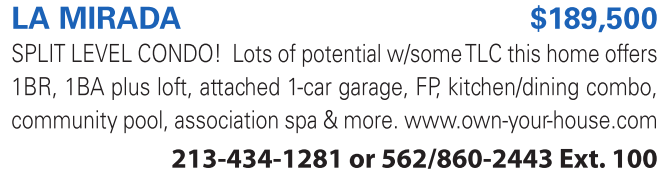 LA MIRADA $189,500 SPLIT LEVEL CONDO! Lots of potential w/some TLC this home offers 1BR, 1BA plus loft, attached 1-car garage, FP, kitchen/dining combo, community pool, association spa & more. www.own-your-house.com 213-434-1281 or 562/860-2443 Ext. 100