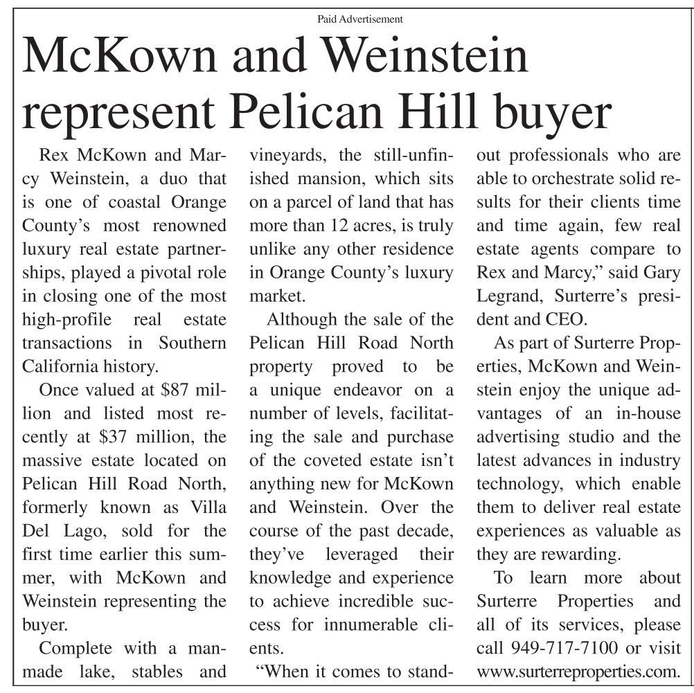 Rex McKown and Marcy Weinstein, a duo that is one of coastal Orange County’s most renowned luxury real estate partnerships, played a pivotal role in closing one of the most high-profile real estate transactions in Southern California history.