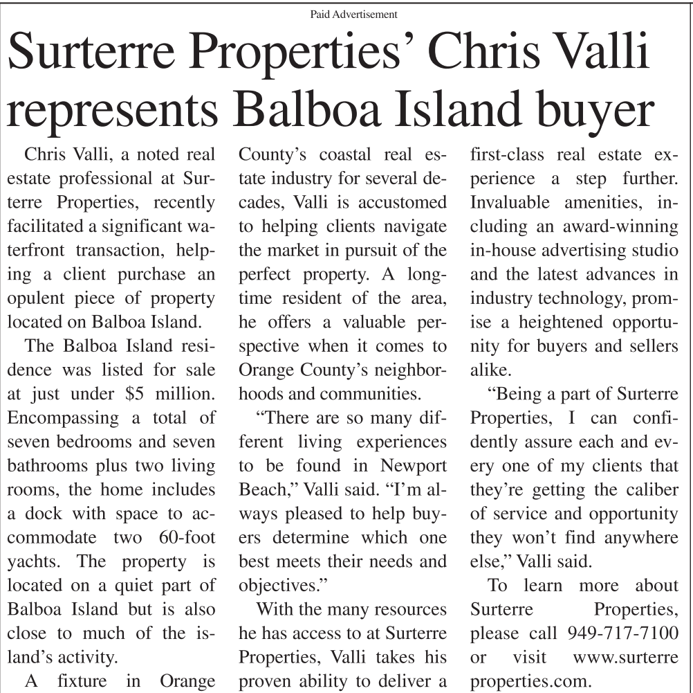 Surterre Properties’ Chris Valli represents Balboa Island buyer