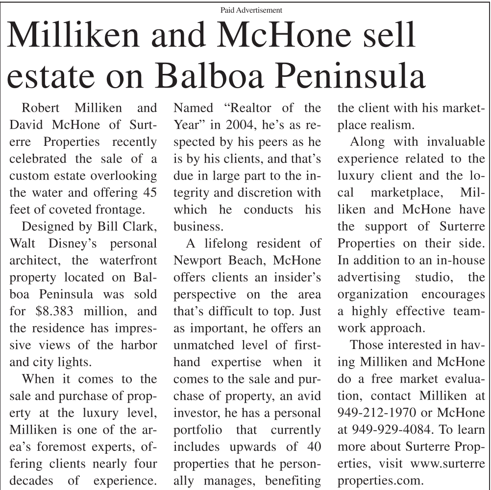 Those interested in having Milliken and McHone do a free market evaluation, contact Milliken at 949-212-1970 or McHone at 949-929-4084. To learn more about Surterre Properties, visit www.surterre properties.com.